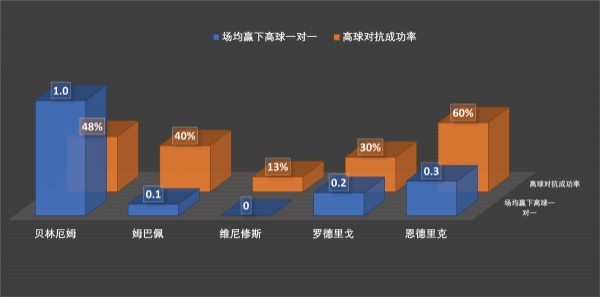 姆巴佩作为名义上的中锋不喜欢争夺头球,他需要队友去争,他找机会冲单刀。不过皇马锋线上场均赢下高球一对一超过1次的只有贝林厄姆,赛季初他还要停赛。很显然,皇马中后场需要承担更重的推进任务。